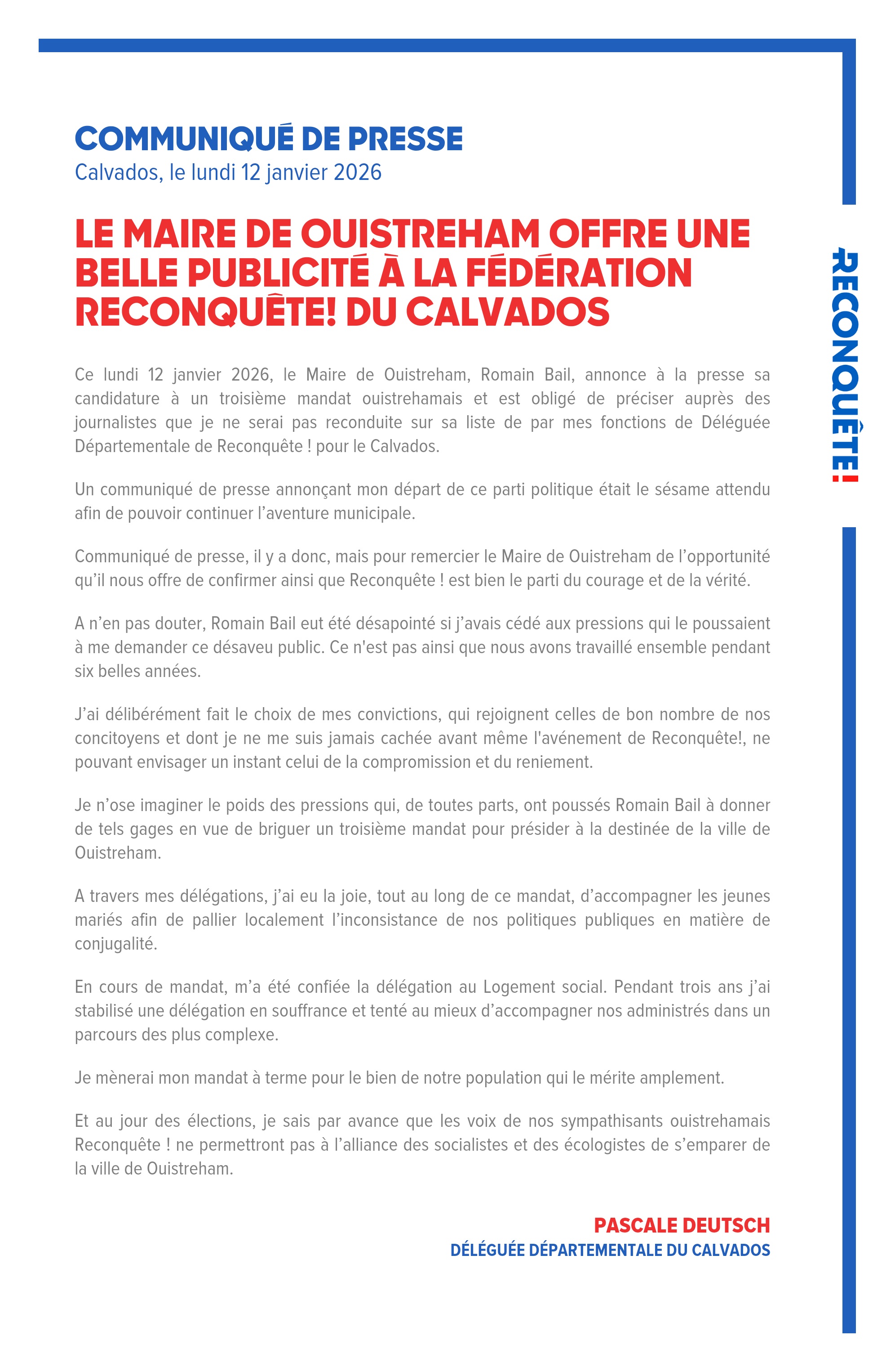 Ce lundi 12 janvier 2026, le Maire de Ouistreham, Romain Bail, annonce à la presse sa candidature à un troisième mandat ouistrehamais et est obligé de préciser auprès des journalistes que je ne serai pas reconduite sur sa liste de par mes fonctions de Déléguée Départementale de Reconquête ! pour le Calvados.
