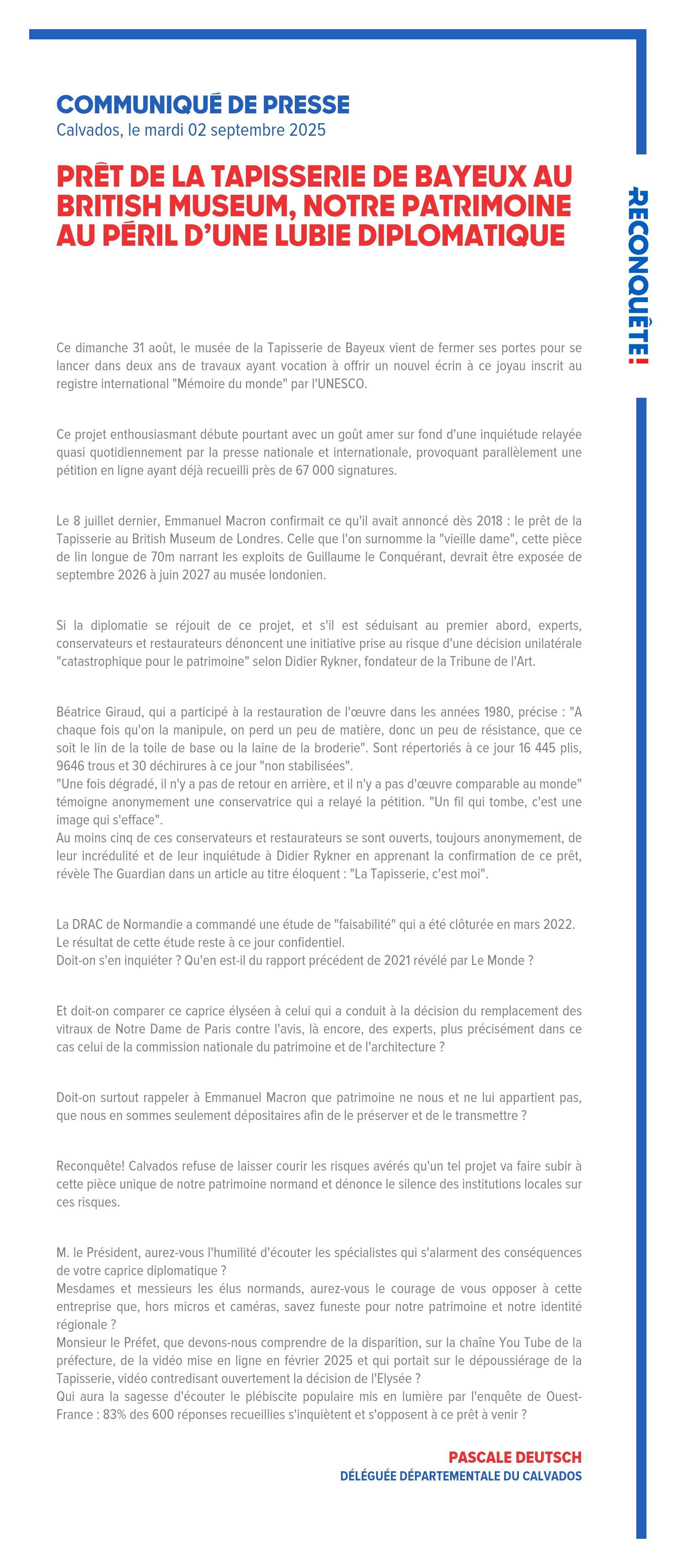 Monsieur le Préfet, que devons-nous comprendre de la disparition, sur la chaîne You Tube de la préfecture, de la vidéo mise en ligne en février 2025 et qui portait sur le dépoussiérage de la Tapisserie, vidéo contredisant ouvertement la décision de l'Elysée ?